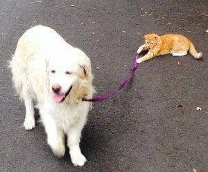 Kona Abbott takes her friend and neighbor, Gracie Slonim, for a walk. Gracie is a 12 year-old golden retriever mix who enjoys working as a therapy dog. Kona is a four year-old rescue cat who loves her neighbor Gracie.