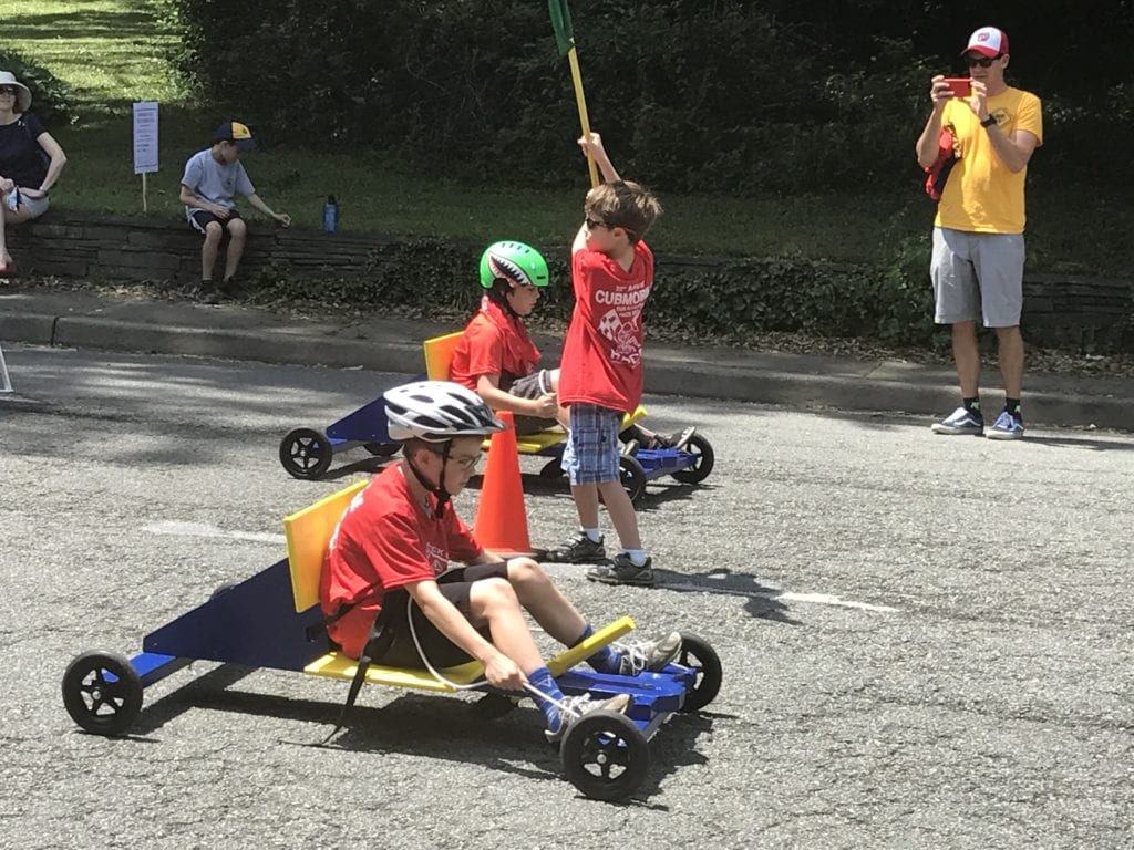Cubmobiles once again graced the streets of Falls Church as over 30 scouts from the Webelos, Bear and Wolf ranks came out for the 22nd annual Cub Scout Pack Cubmobile races on the Oak Street hill in front of Thomas Jefferson Elementary School on Sunday, June 4. Special thanks were extended to the Falls Church Volunteer Fire Department EMT’s who kept the scouts safe and injury-free throughout the event. (Photo: Emily Draper)