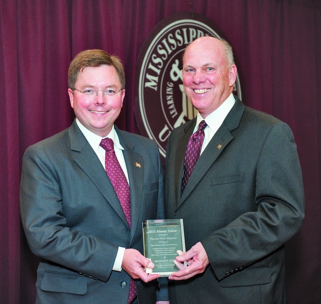 The Mississippi State University Alumni Association welcomed the 2012 class of Alumni Fellows to campus for a series of meetings and lectures with students, both in the classroom and informally. In this year’s class of Alumni Fellows is Thomas H. “Hunt” Shipman, of Falls Church. He is pictured above (at left) with George Hopper, dean of the MSU College of Agriculture and Life Sciences. Shipman was selected for the College of Agriculture and Life Sciences. He is a 1992 agribusiness graduate, who is a partner at Cornerstone Government Affairs LLC. Sponsored by the MSU Alumni Association, the colleges, the Meridian campus and the Office of the Provost, the fellows program recognizes alumni who have distinguished themselves in their respective careers. (Photo: Courtesy Harriet Laird)