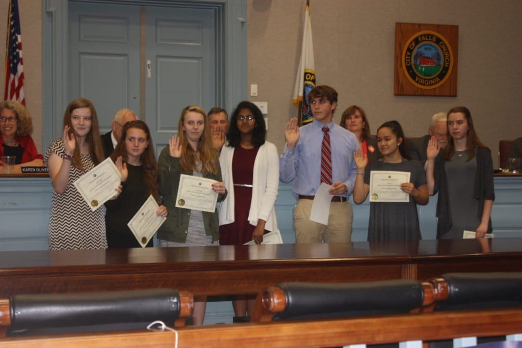 Sworn in by City Clerk Celeste Heath to serve on Falls Church boards and commissions at the F.C. City Council meeting last week were these George Mason High School students, among the 13 new high school students selected by the Citizens for a Better City and recommended to the Council. (Photo: News-Press)