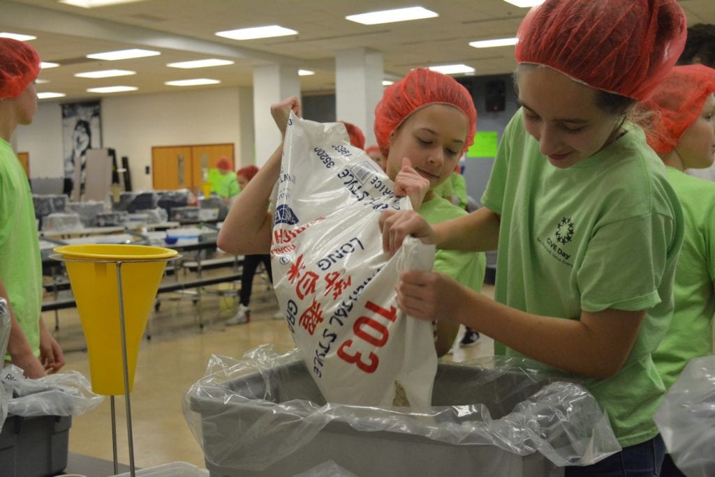 Over 80 GIVE Day ambassadors at Mary Ellen Henderson Middle School used their club meeting time and fundraising efforts to put together a day of giving for all the students in the school on “Giving Tuesday,” Nov. 27. By grade, every student had a chance in the three sessions to assemble, measure, seal and pack 33,000 meals that will be shipped by the non-profit Rise Against Hunger to destinations that will include Haiti, Madagascar and India. A special thanks is extended to the MEHMS Parent-Teacher Association for its organizational oversight and to all the donors who helped the students reach the $10,000 goal to cover the costs of the rice, soy, dried vegetables and vitamins that make up each six-serving meal packet.