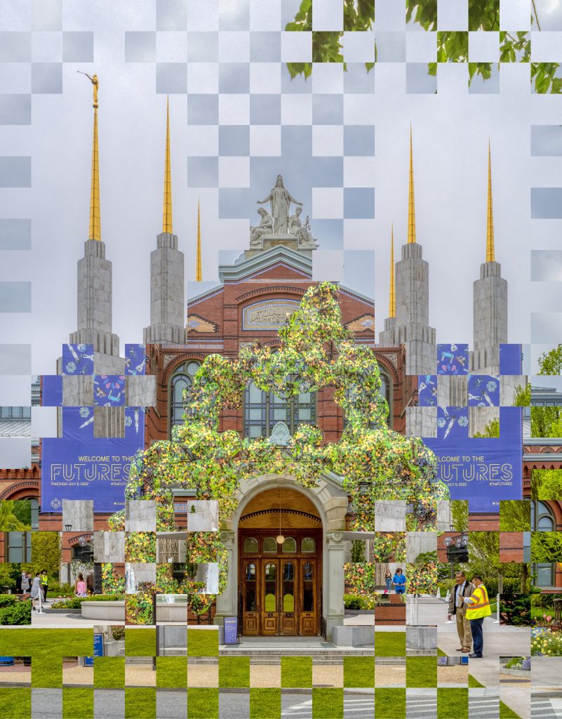 James Hengst’s “Temple Arts and Industries” (Remix Series) brings the art of collage into the digital world by the merging of photographs of two well-known edifices: the Mormon (Latter-day Saints) Temple in Kensington, Maryland, and the Art and Industries Building in Washington, D.C. They have been combined digitally with a checkerboard-style grid. Although the two buildings have different architectural styles, the two unify surprisingly well—according to the title card: “the statue of Columbia atop the Arts and Industries building resembling a religious icon perched among the [LDS] temple spires […] to show or hide various elements in each image.”