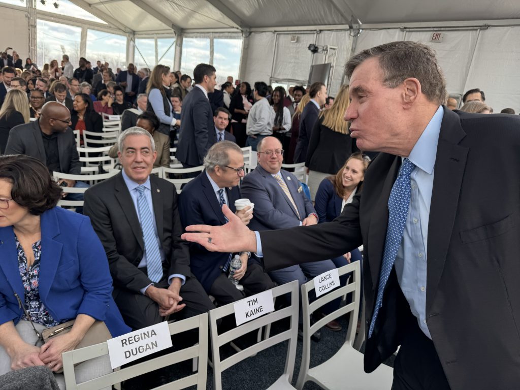 Warner spoke before hundreds of state and regional officials, including Gov. Glenn Youngkin and Sen. Tim Kaine, gathered for the event. With all the kudos and congratulatory remarks about the new campus, Warner said he had to address “the elephant in the room,” the cutting by Trump of funds mandated by Congress for vital national security-related R&D. “No administration can take away what Congress has mandated, and I will stand with Virginia Tech students and everyone involved in our effort to compete with China.”