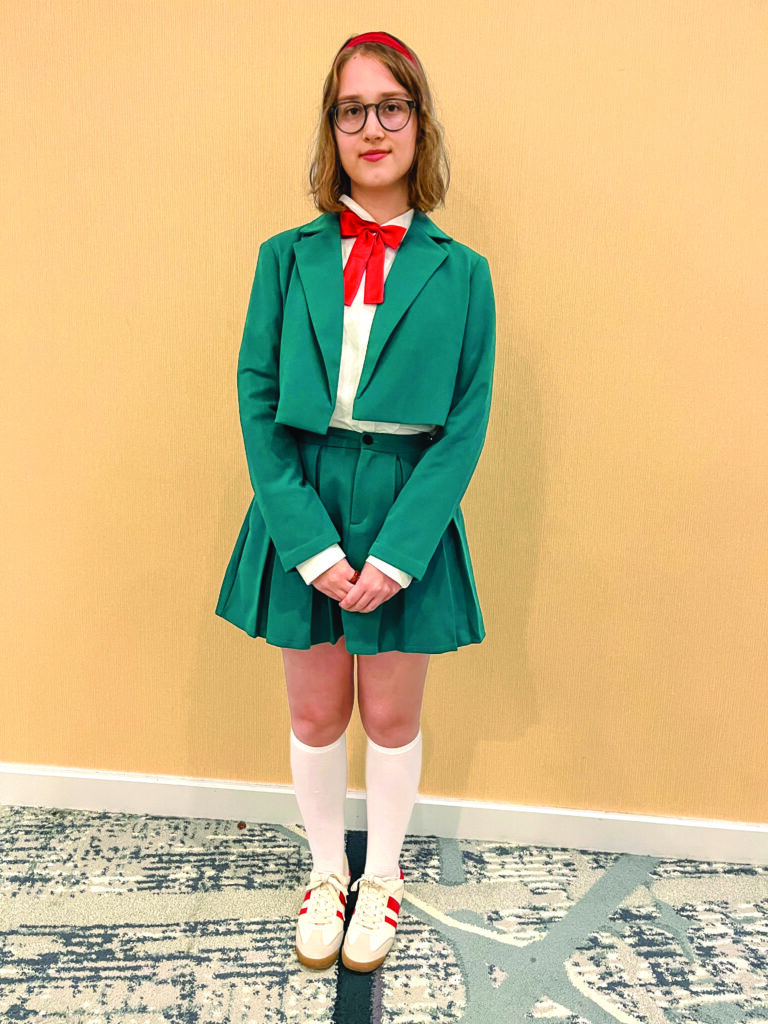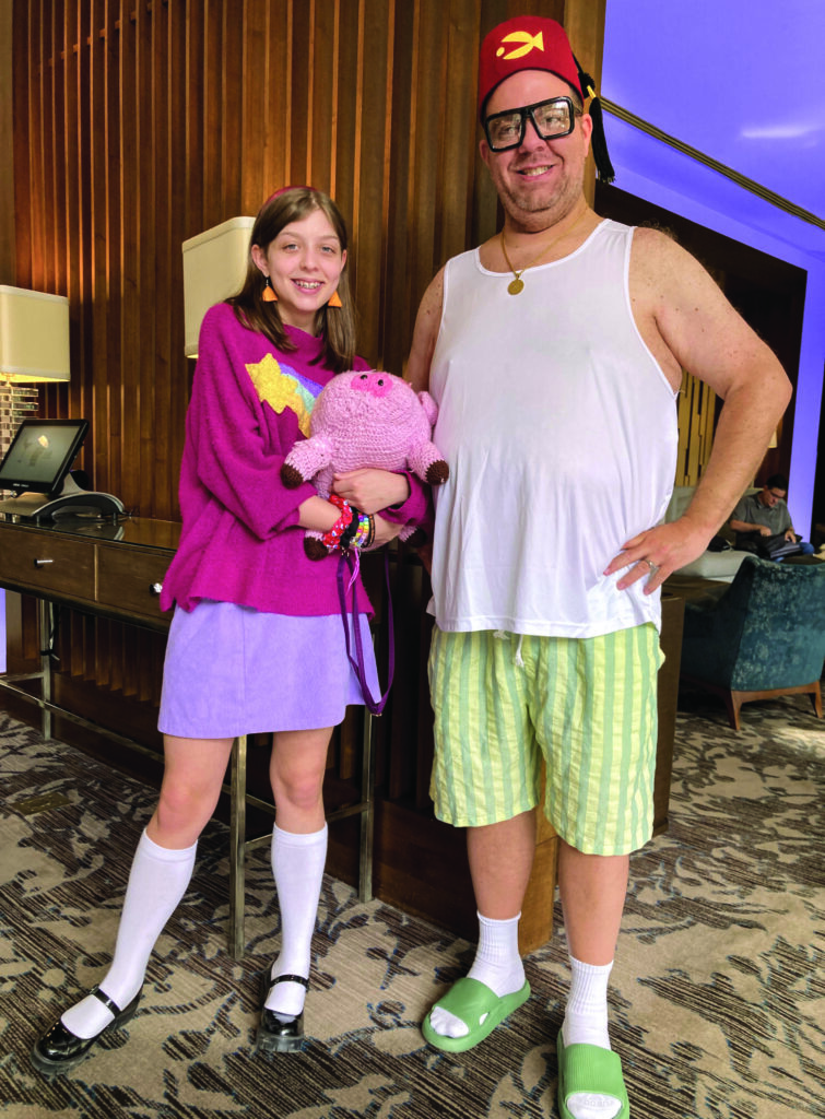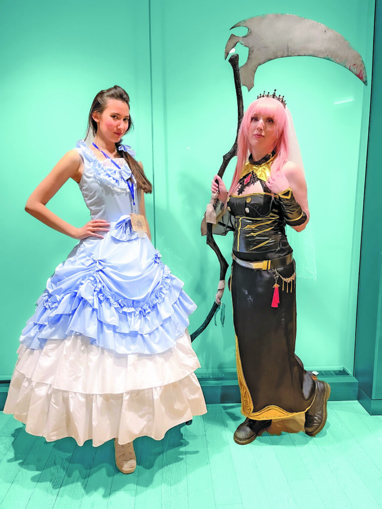 We found Cordelia, dressed in Rococo- and Victorian-inspired Japanese Lolita fashion, in conversation with Grayson, who cosplayed Hololive’s Mori Calliope. Grayson is from Fairfax, studies graphic design at George Mason University, and anticipates Halloween with her Japanese-style Grim Reaper Mori character, complete with scythe. Of course, AnimeUSA has a broader appeal than merely college students interested in Japanese anime. We met, for instance, the father-and-daughter cosplayers Justin and Anastasia, who portrayed Mabel and Grunkle (“grand uncle”) Stan, the latter with a Shriner-style red fez iconic to his character. These two characters stem not from anime at all but from the Disney Channel’s “Gravity Fall” animated television series.