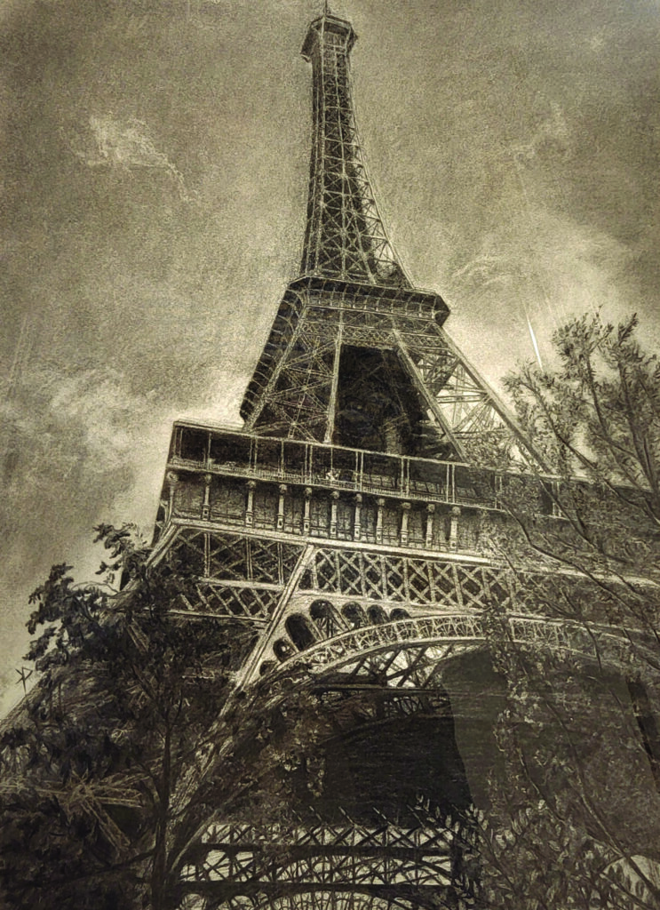 If ever there has been photorealism, “We’ll Always Have Paris” would be it! This work at first glance appears to be a scratchy black-and-white analog photograph, but upon further inspection, to one’s amazement, it is in fact a charcoal drawing. Here we see an odd angle of the Eiffel Tower through which captivating details become prominent parts of the image. The building, as many may know, was originally conceived for the 1889 World’s Fair. The tower is an incredibly complex engineering feat, and here we see that incredible form equally impressively flattened onto paper, holding the three dimensionality with jaw-dropping detail. To create such a work in any medium is something extraordinary, but to do so with a powdery, free-flowing, easily movable medium such as charcoal places this work in a league all its own.