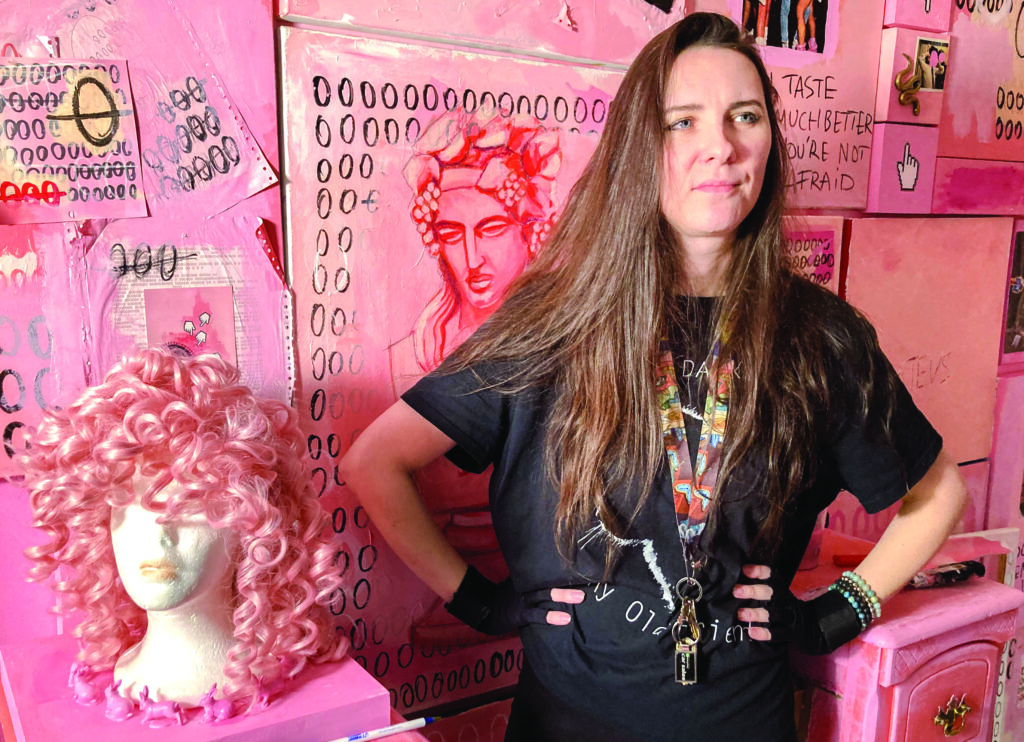 One of the pleasures of attending the event was speaking with the artists. We met, for example, Sam, who goes by the moniker The Strange Lens. She has multiple spaces at the studio where she works in the color pink in different media and on artworks from the traditional to the practical to the abstract. When I asked her about this monochrome color choice, she told me she was influenced greatly by the late David Lynch, creator-producer of the cult television series Twin Peaks. Despite watching Twin Peaks on black-and-white television in her native Ukraine, she always had the image pink in mind. We asked Charles Edward Andrew Lincoln IV about this, for he is a writer publishing an essay about the esoteric philosophy behind the TV series. Mr. Lincoln had this to say: “The choice of one unique color becomes what Lynch would call a ‘world-within-a-world,’ a space where heightened emotion quietly leaks through everyday objects. An all-pink room or studio is almost a new world into which you escape. That’s exactly how Lynch uses color in Twin Peaks, not as decoration, but as a portal into a different emotional register.”
