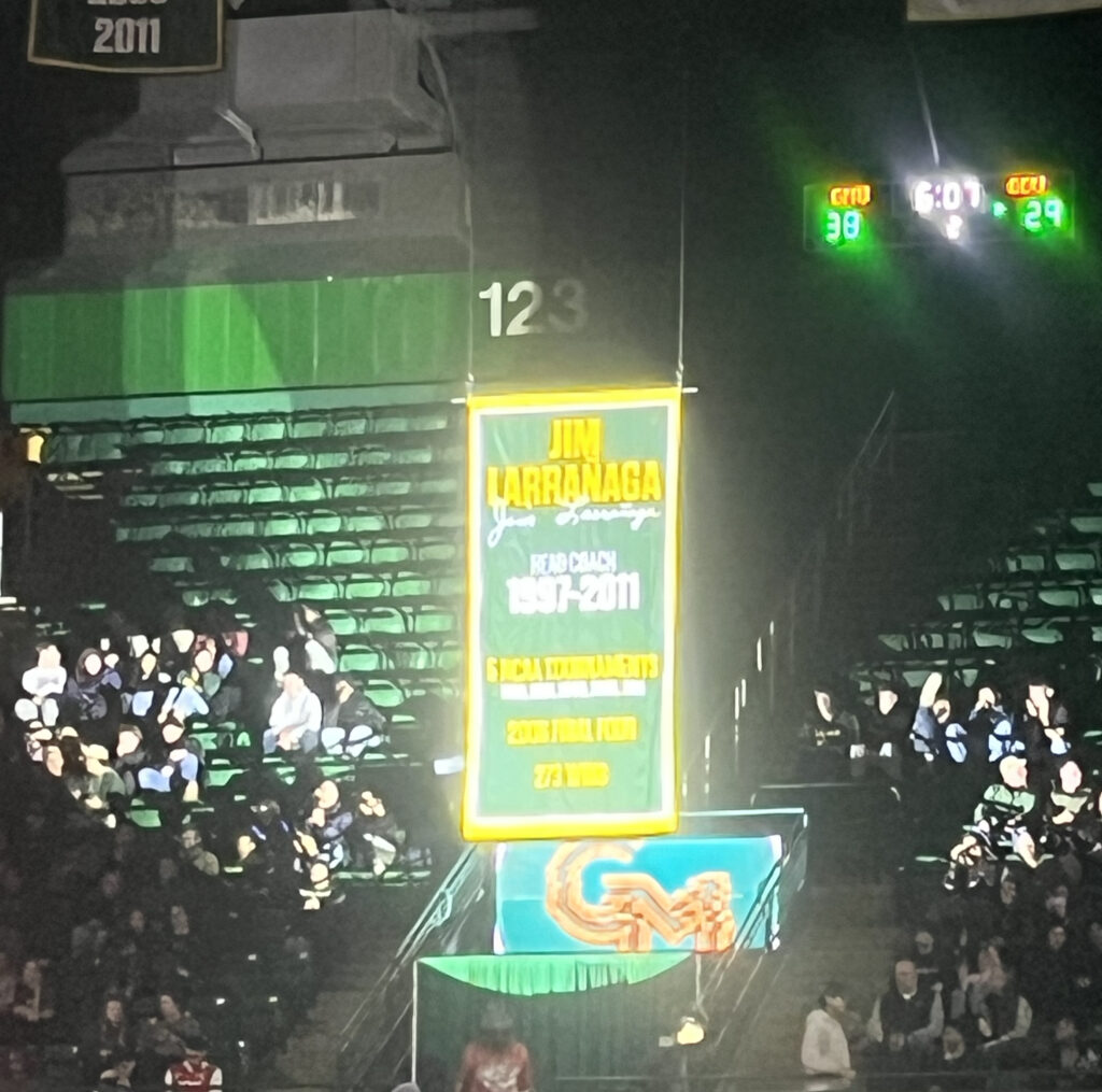 The athletic department honored Larrañaga with a halftime ceremony in which a permanent banner celebrating his storied George Mason career was raised to the rafters. His 2006 team joined him on the floor to culminate a nostalgic week of festivities marking the “Kryptonite Kids” 20th anniversary.